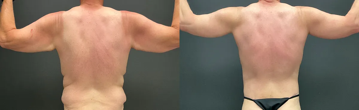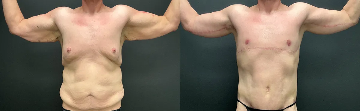Man in his 50s with significant weight loss after 2- stage whole body transformation. His procedures included a tummy tuck/lower body lift with high definition liposuction and fat transfer to his buttocks, followed by an arm lift, outer chest lift, and chest lift with free nipple grafts.