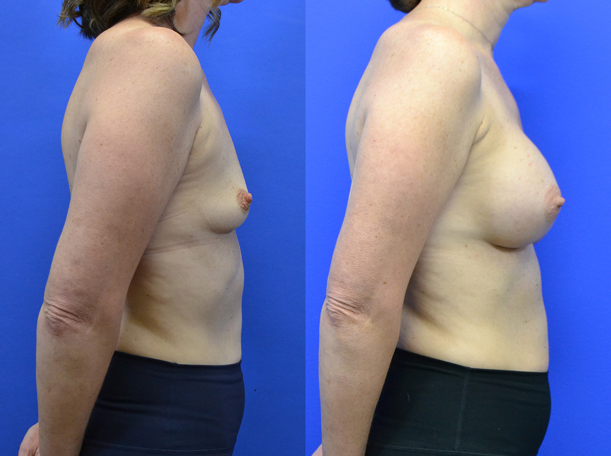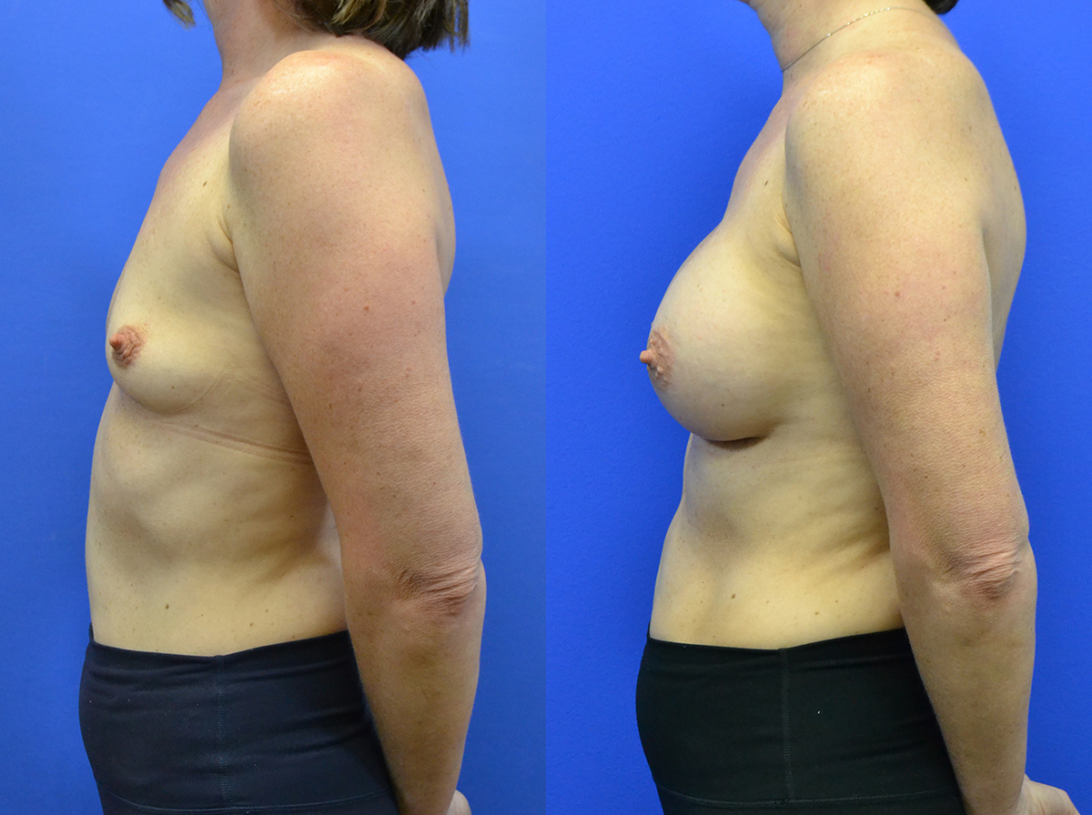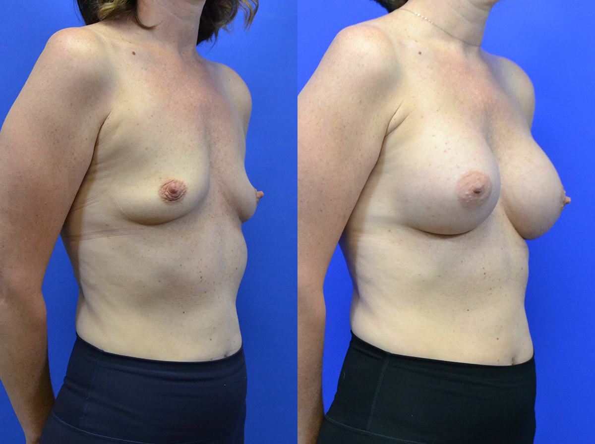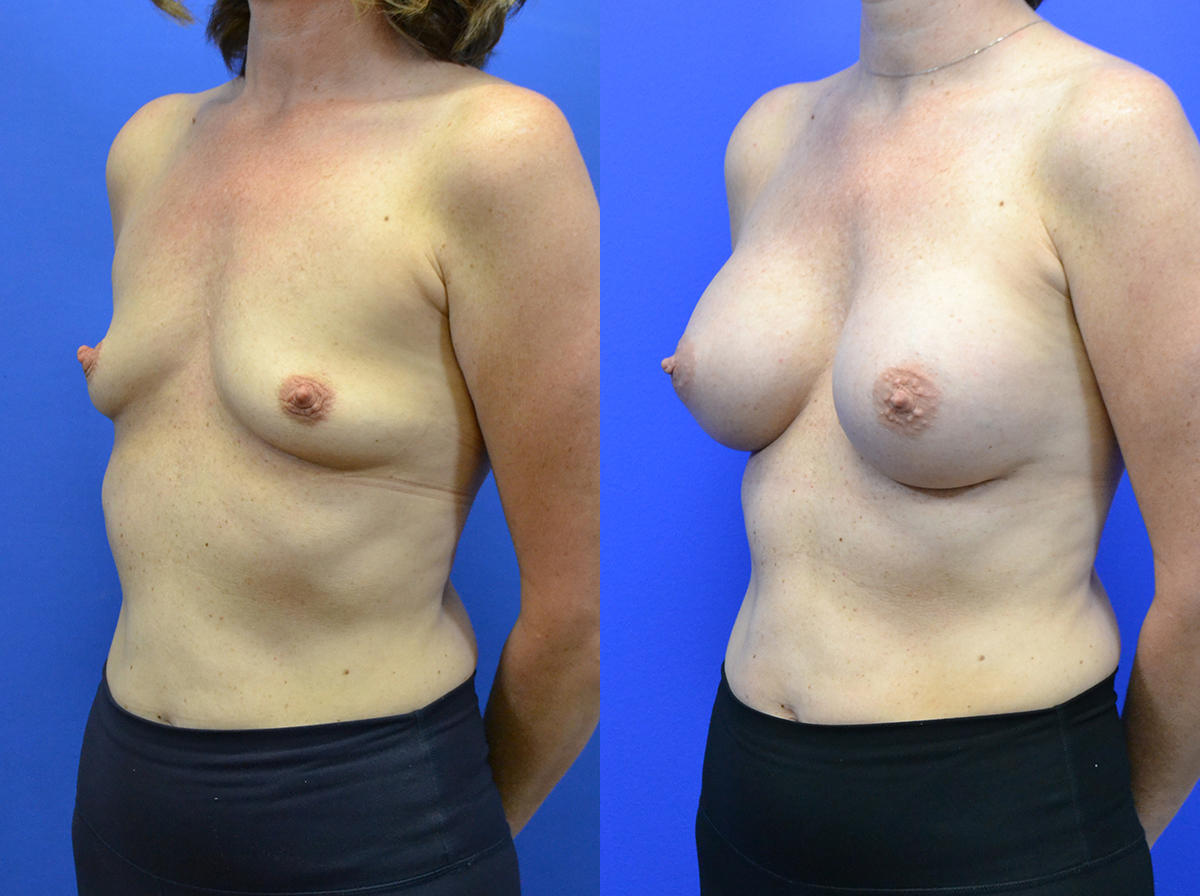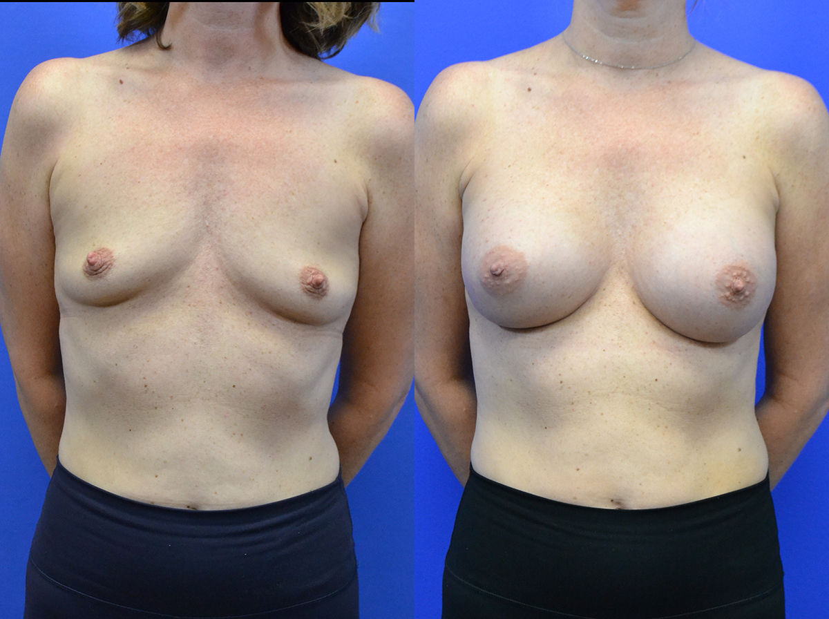 Patient in her 40’s before after breast augmentation. Implants were gummy bear high profile 450 cc, placed under the muscle