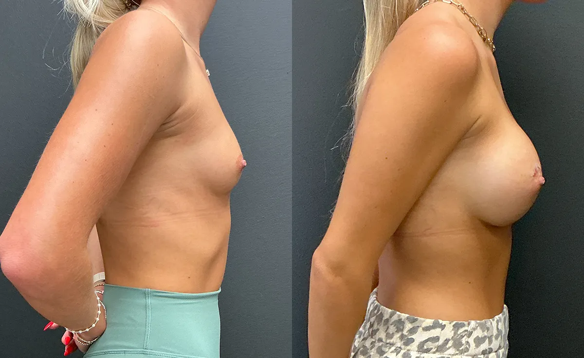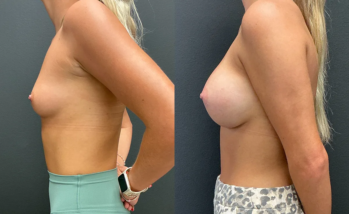 Patient with facial breast, augmentation and mesh internal bra. implants were replaced above the muscle in the sub acial plane. 355 cc full profile round silicone implants.