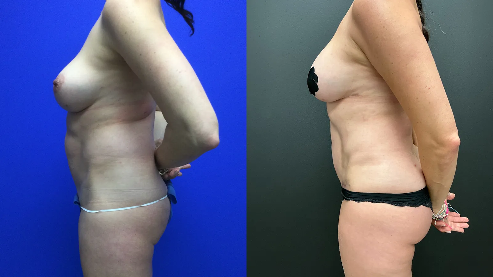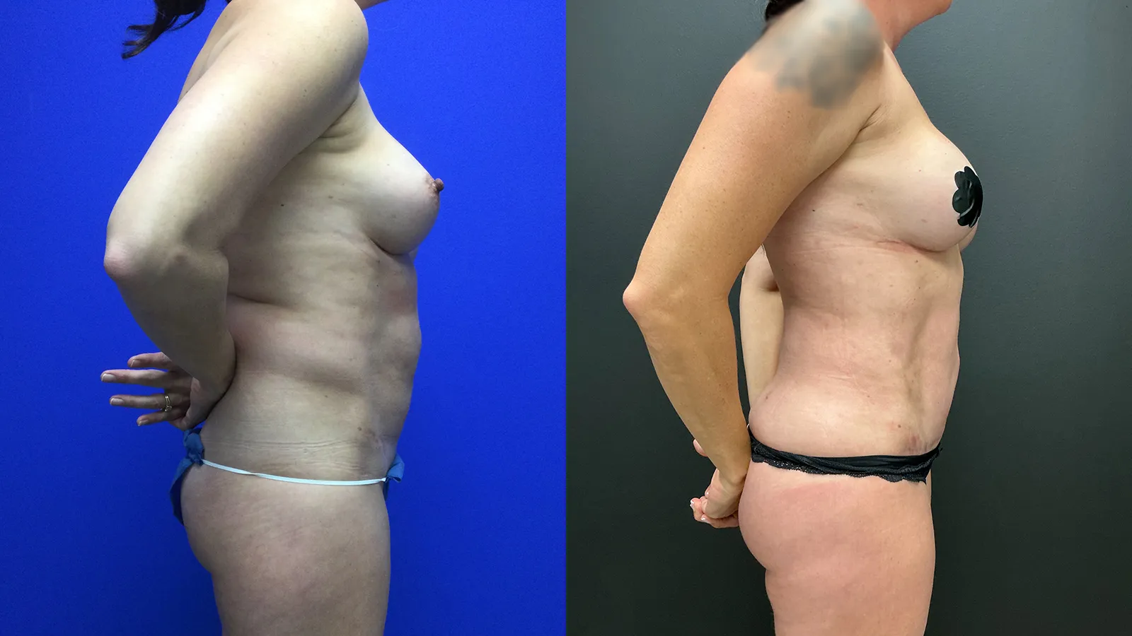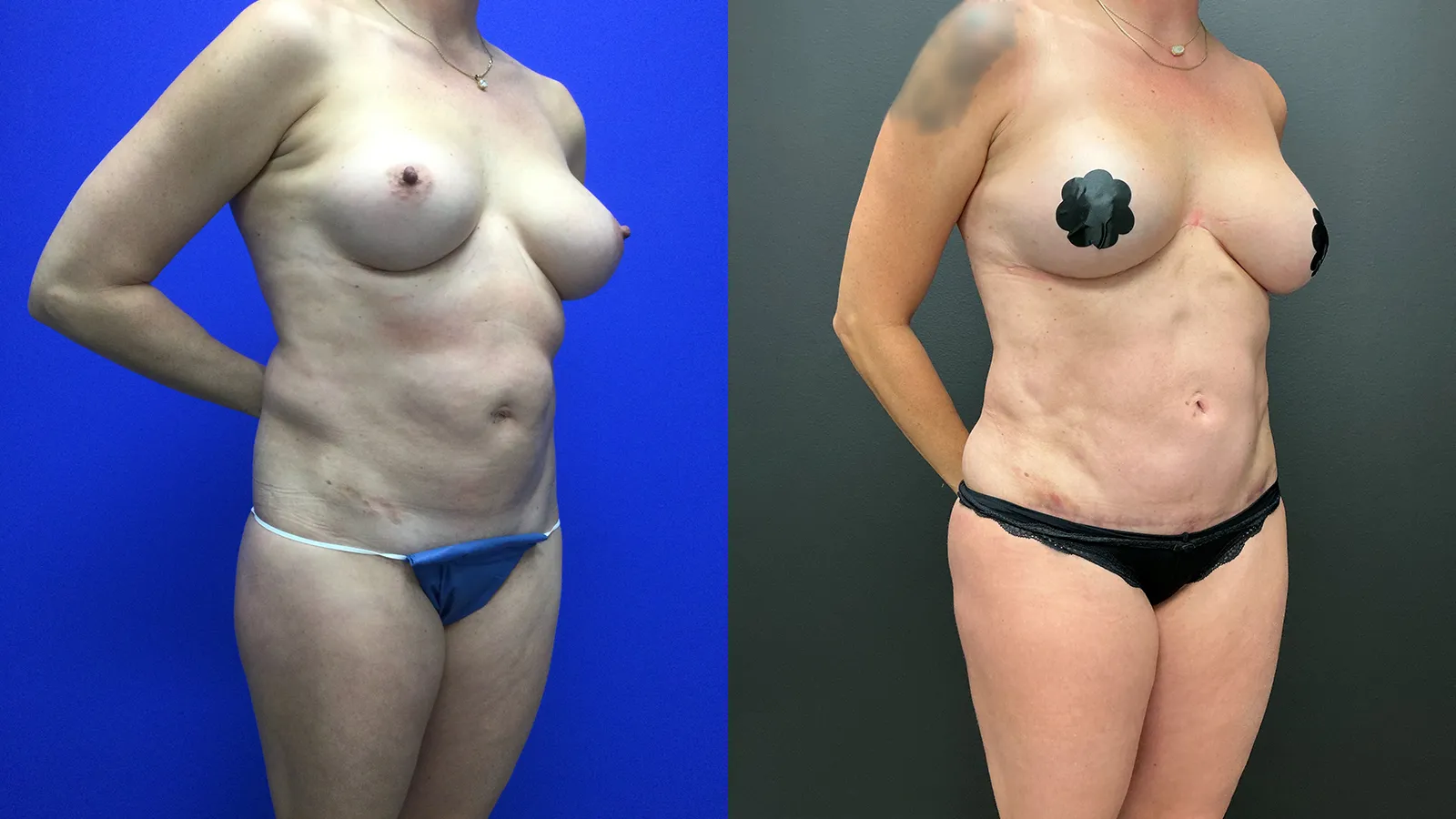 Patient in her 40’s with prior botched lipo abdomen done elsewhere and prior breast augmentation. We performed a dual tuck including a full reverse tummy tuck, mini tummy tuck , breast fold reconstruction and Hi-Def 360 lipo and BBL.