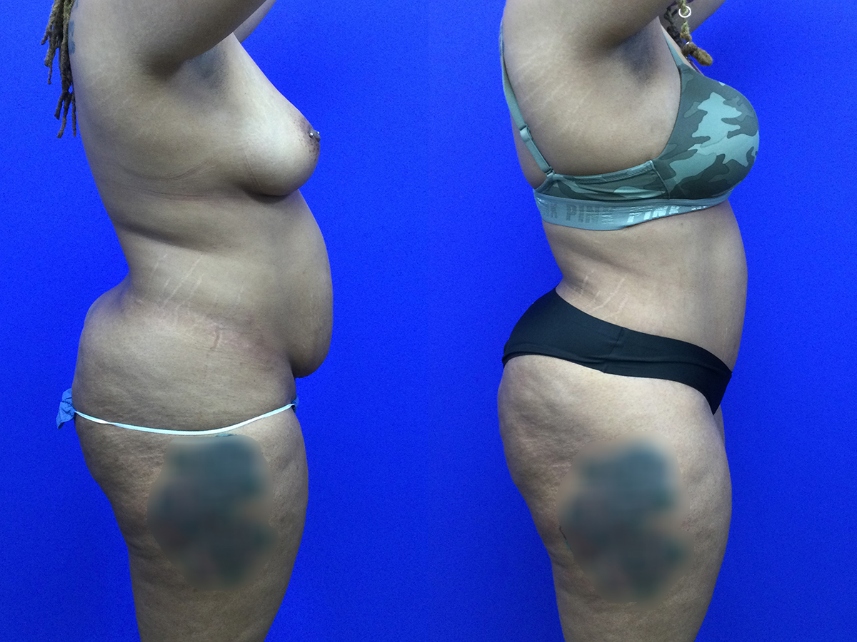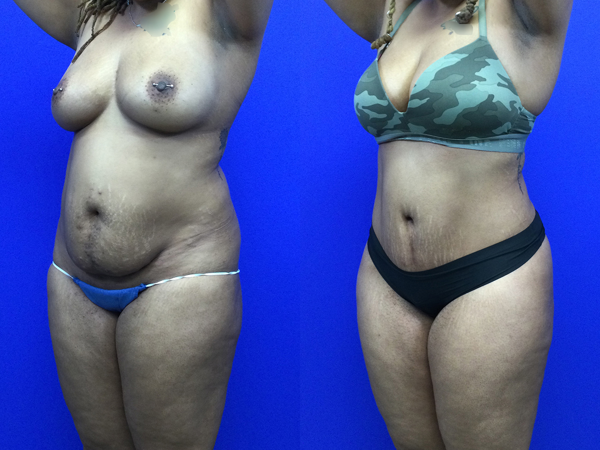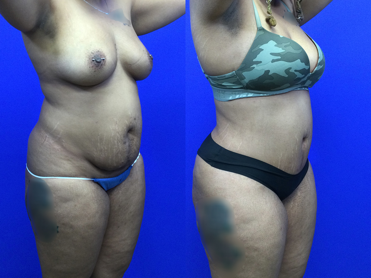 Plus size (BMI 34) patient in her 30’s before/after extended tummy tuck, Hi-Def lipo and fat transfer hip dips’