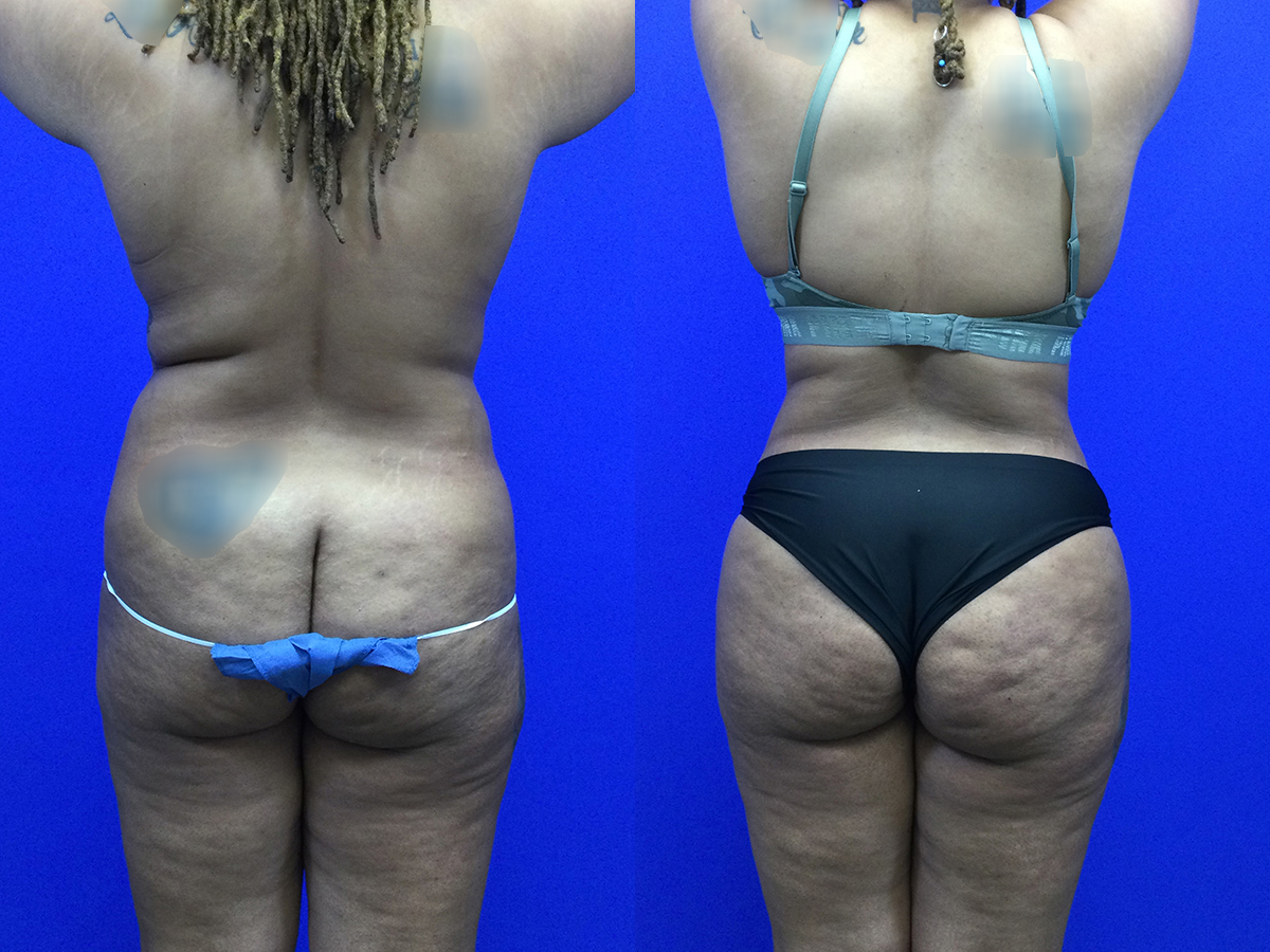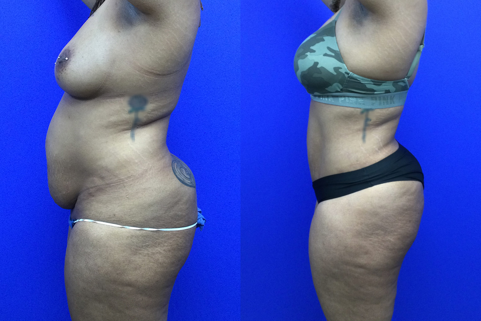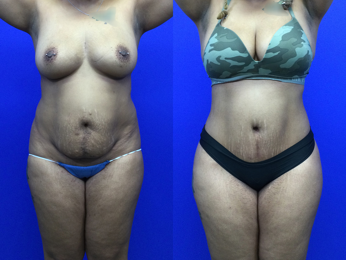 Plus size (BMI 34) patient in her 30’s before/after extended tummy tuck, Hi-Def lipo and fat transfer hip dips’