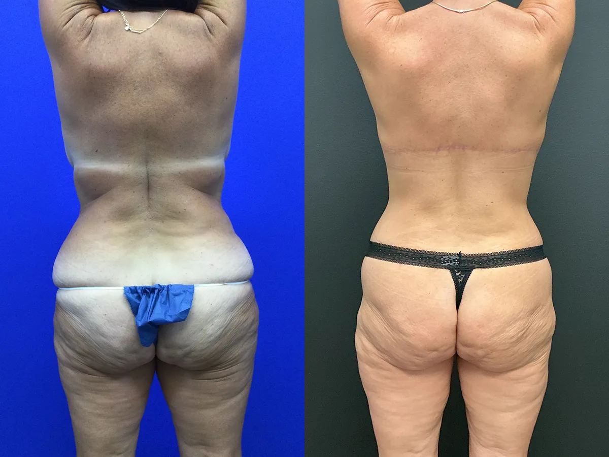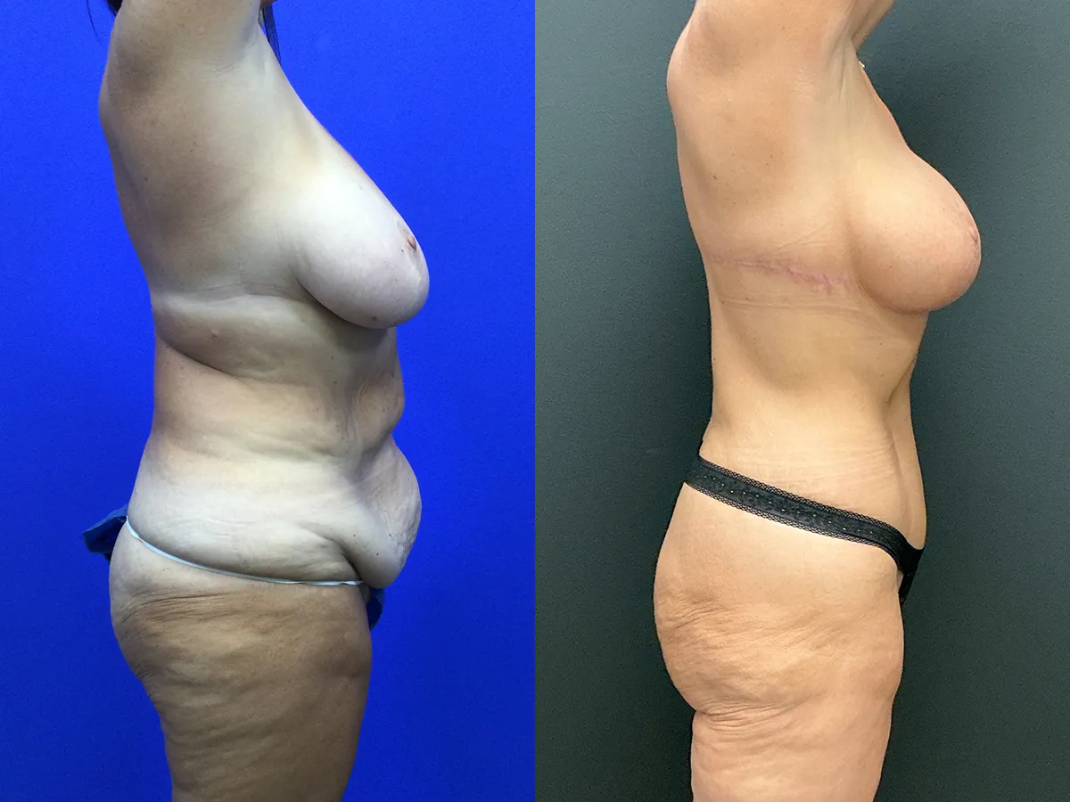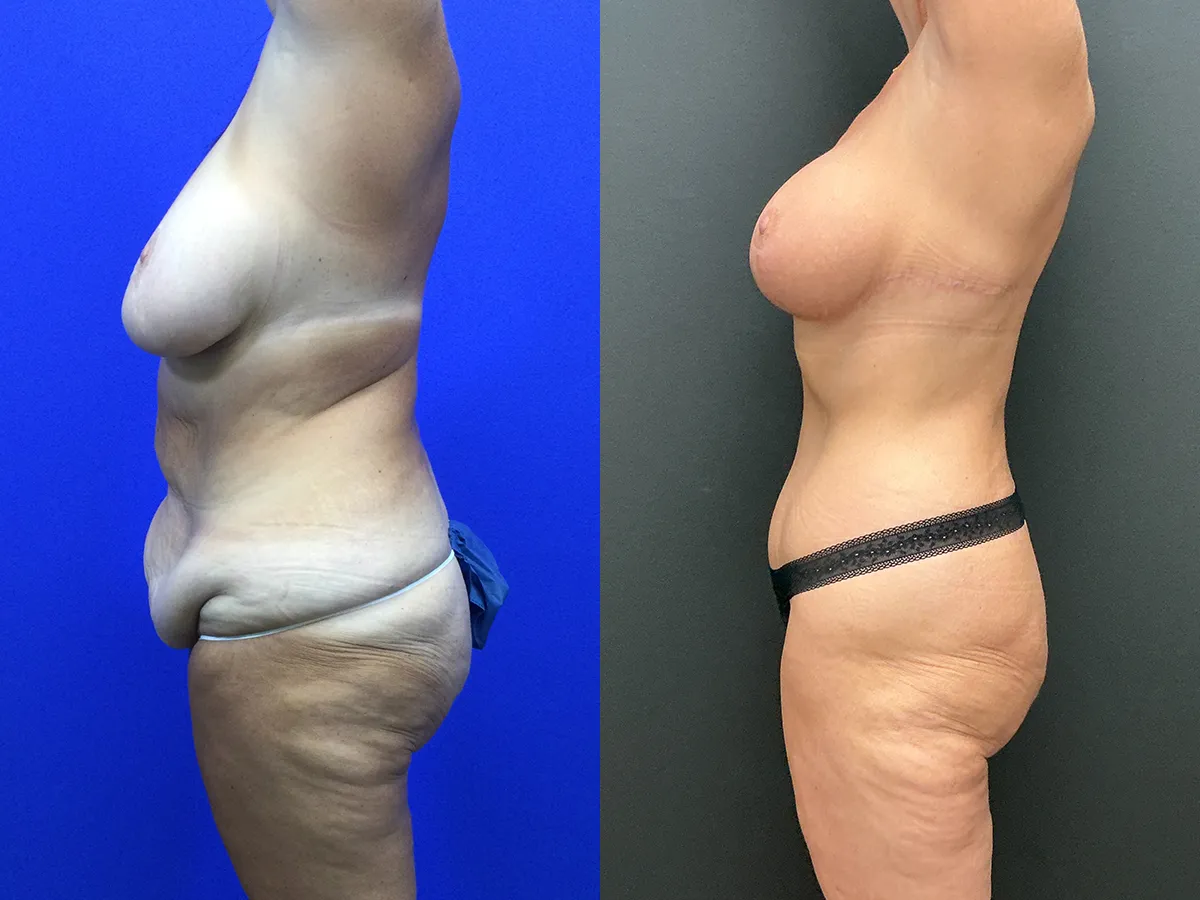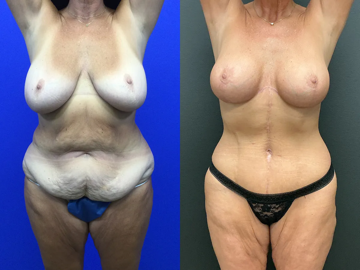 Patient in her 50s with Prior breast reduction surgery shown after fleur-de-lis tummy tuck with 360 high definition liposuction, upper back lift/upper body lift and breast lift with implants. Implants used were 310 cc gummy bear cohesive silicone implants placed above the muscle and the subfascial plane with a mesh internal bra.
