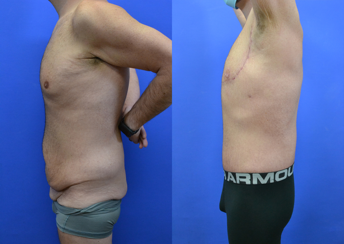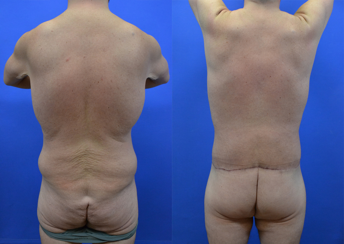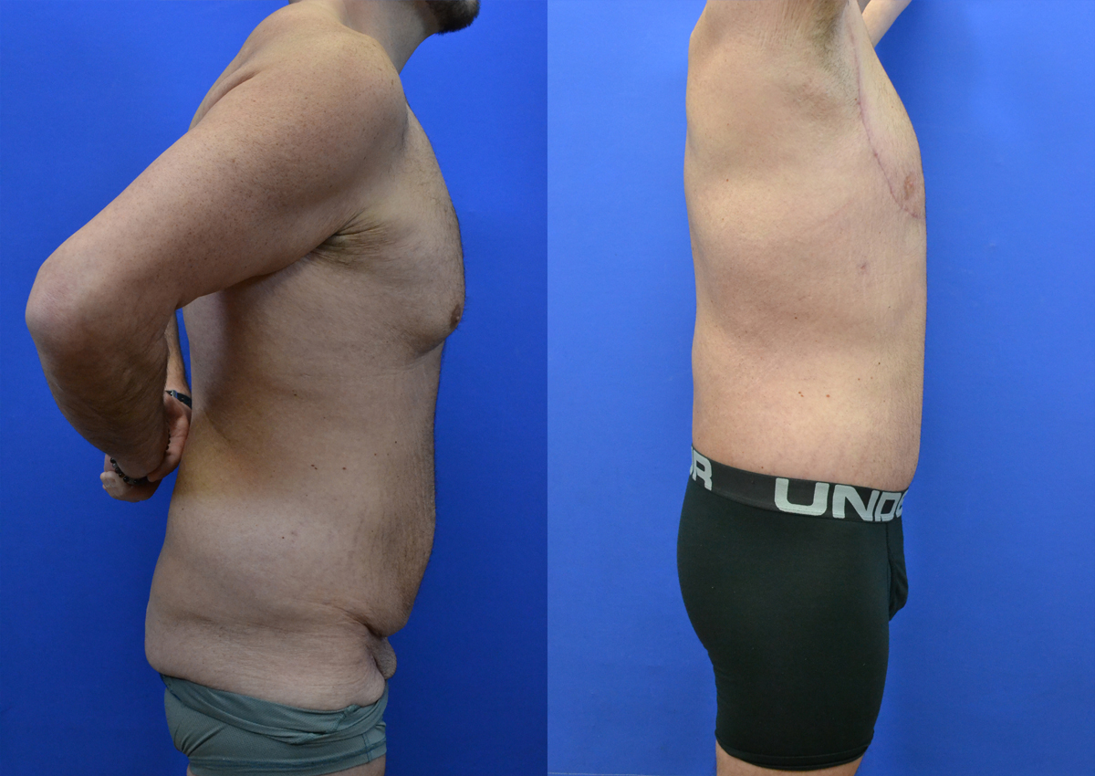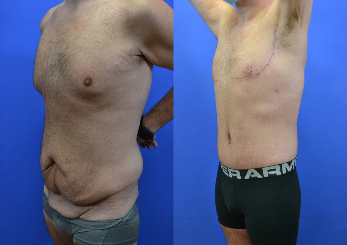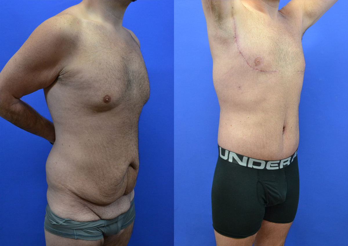 Patient in his 30’s with weight loss before/after chest lift/gynecomastia repair with free nipple graft and tummy tuck/lower body lift with fat transfer buttocks