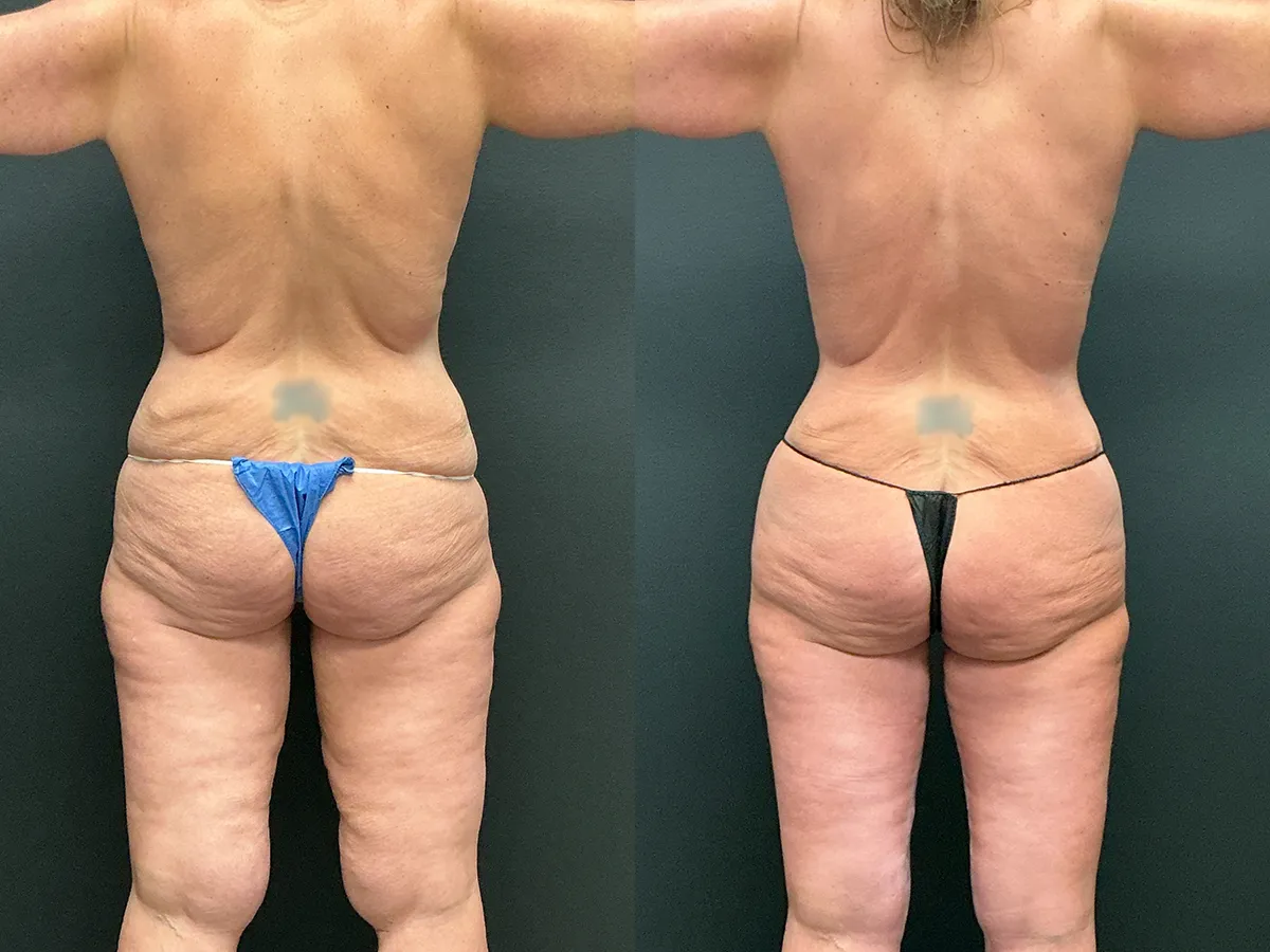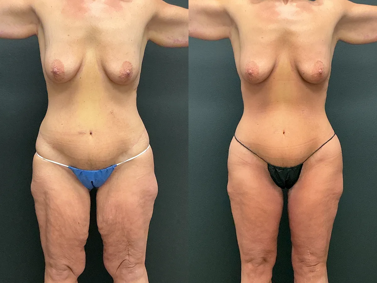 Patient in her 40’s before/after medial thigh lift with lipocontouring and BBL. Her prior tummy tuck was done elsewhere.