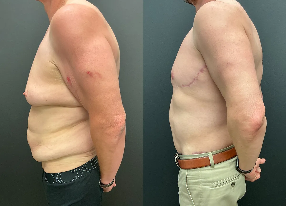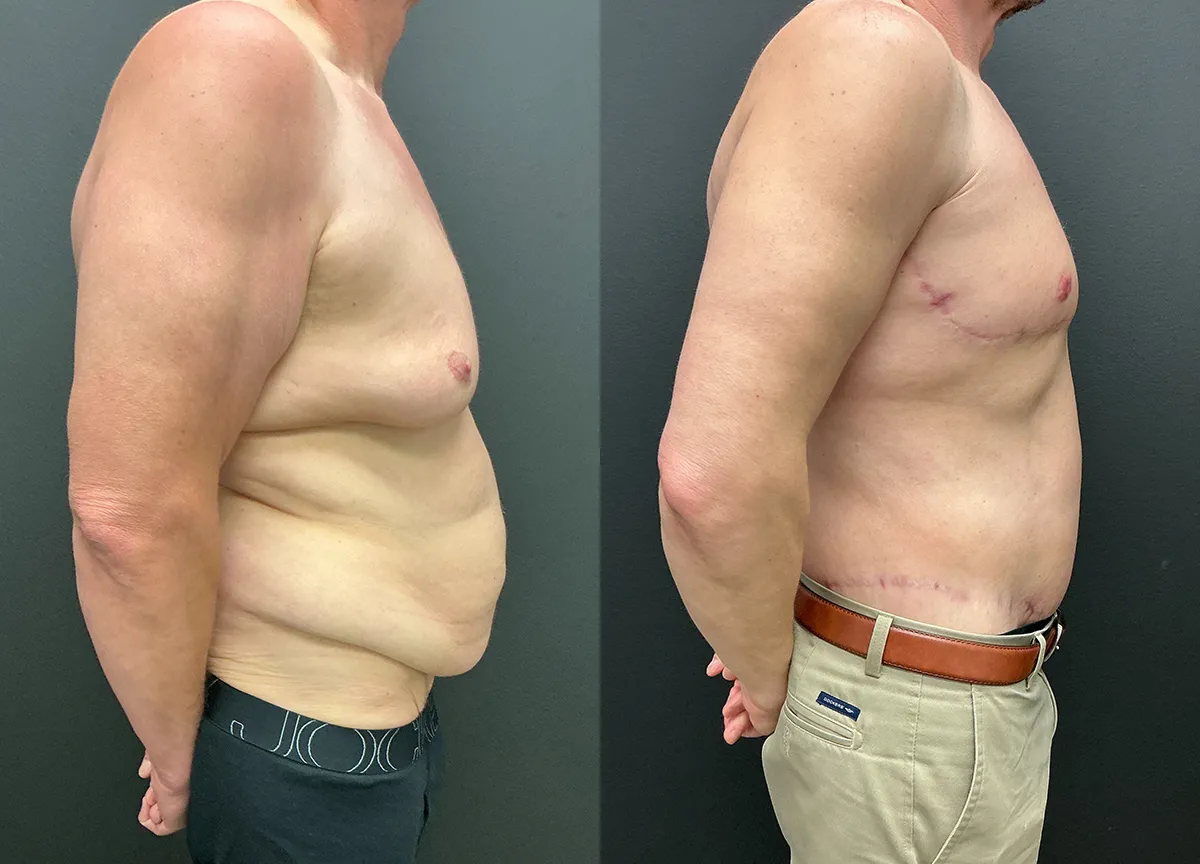 Male is 50s with weight loss shown before and after tummy tuck/lower body lift with Hi-Def lipocontouring and BBL. His second surgery included arm and chest lifts with free nipple grafts and lipocontouring