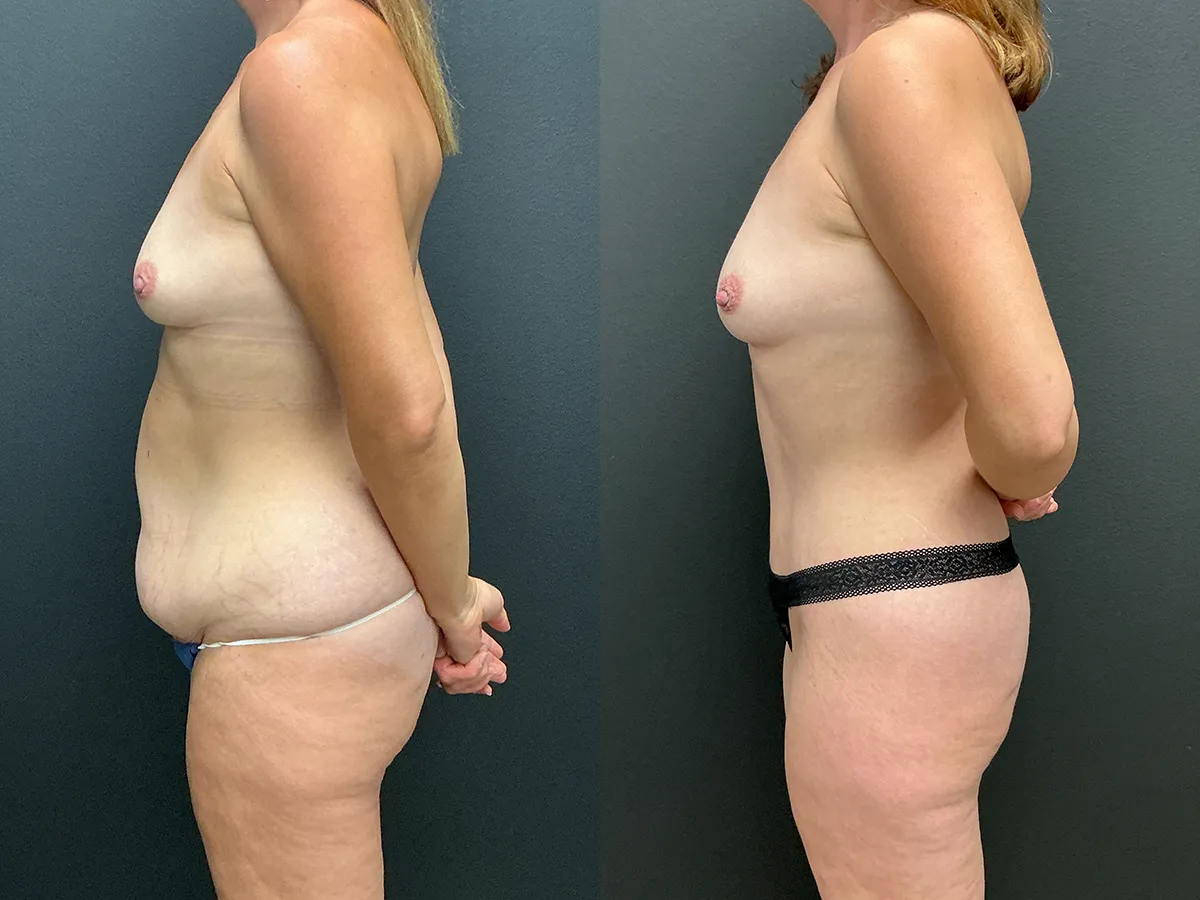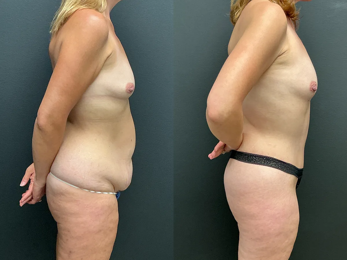 Patient in her 40s shown 3 months postoperative that we performed an extended tummy tuck on with high definition liposuction and fat transfer hip dips. A lower body lift had been recommended to obtain best results, but we were still able to create exceptional waist, hip and buttock shape without doing 360 lipo or lower body lift.